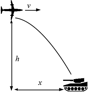Самолет летит на высоте \(h\) метров со скоростью \(v\) м/c. Ему необходимо поразить бомбой цель. На каком расстоянии \(x\) от цели (в метрах) необходимо выпустить бомбу?