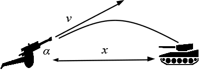 Пушка стреляет снарядом со скоростью \(v\) м/c под углом \(\alpha\) к горизонту (в радианах). На каком расстоянии \(x\) (в метрах) от пушки упадет снаряд?