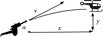 Пушка стреляет снарядом со скоростью \(v\) м/c и должна поразить цель, находящуюся на расстоянии \(x\) метров по горизонтали и на высоте \(y\) метров. Под каким углом \(\alpha\) к горизонту (в радианах) необходимо произвести выстрел?