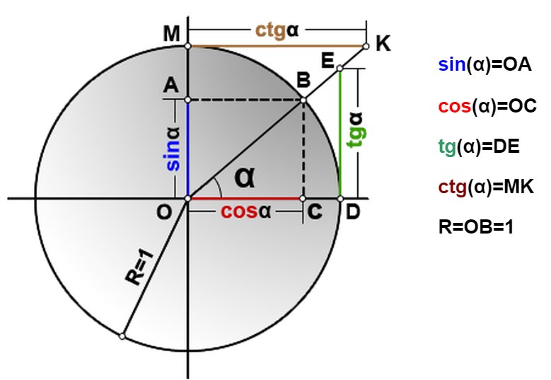 Функции синус, косинус, тангенс и т.д. называются тригонометрическими. Рассмотрим окружность радиуса 1 с центром в нуле, а также положительное число $x$. Возьмём нитку длины $x$, привяжем её к точке $(1,0)$ и намотаем на окружность против часовой стрелки. Абцисса получившейся точки (координата по оси $Ox$) будет равна $\cos(x)$, а ордината — $\sin(x)$.