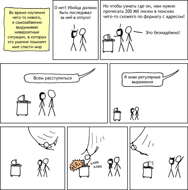 Регулярные выражения, или коротко, регулярки — это очень мощный инструмент. Но использовать их следует с умом и осторожностью, и только там, где они действительно приносят пользу, а не вред. Во-первых, плохо написанные регулярные выражения работают медленно. Во-вторых, их зачастую очень сложно читать, особенно если регулярка написана не лично тобой пять минут назад. В-третьих, очень часто даже небольшое изменение задачи (того, что требуется найти) приводит к значительному изменению выражения. Поэтому про регулярки часто говорят, что это write only code (код, который только пишут с нуля, но не читают и не правят). А также шутят: Некоторые люди, когда сталкиваются с проблемой, думают «Я знаю, я решу её с помощью регулярных выражений.» Теперь у них две проблемы.